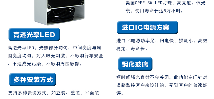 ★功率可調(diào),根據(jù)現(xiàn)場光照環(huán)境調(diào)節(jié)燈光亮度,在滿足圖像效果的前提下盡量減少光功率,節(jié)能環(huán)保;
